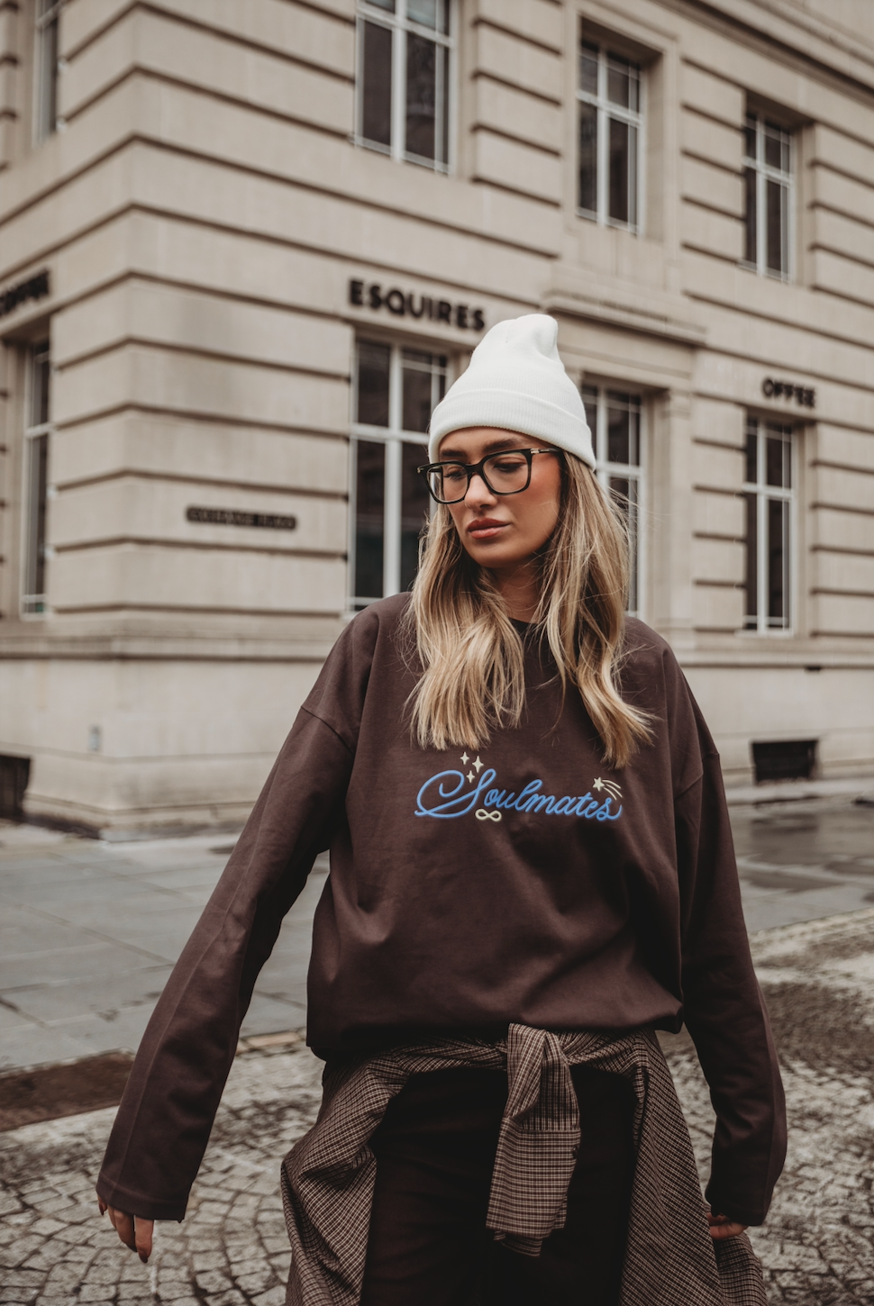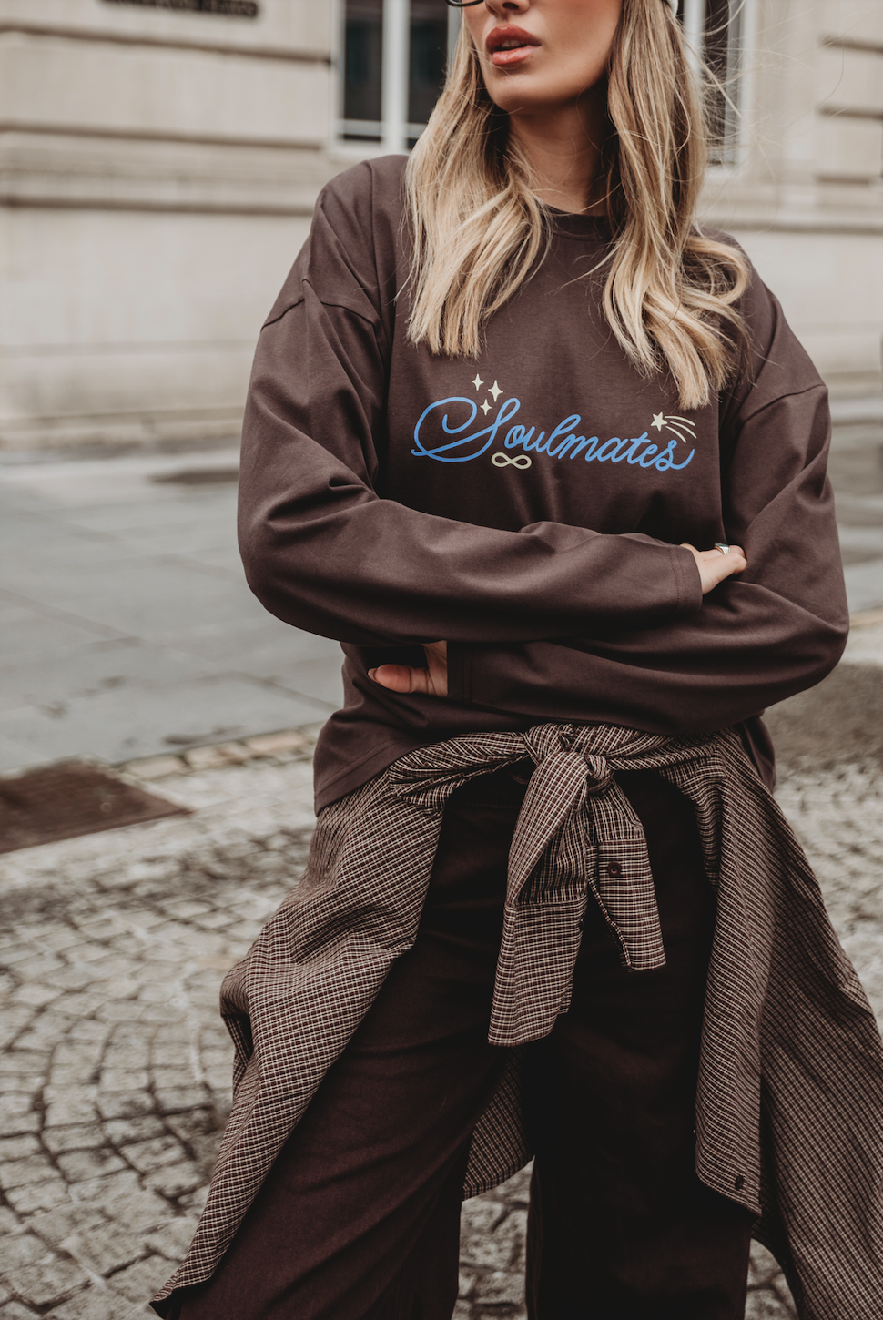 Brown oversized long sleeve top with hand-painted soulmates printed onto front chest