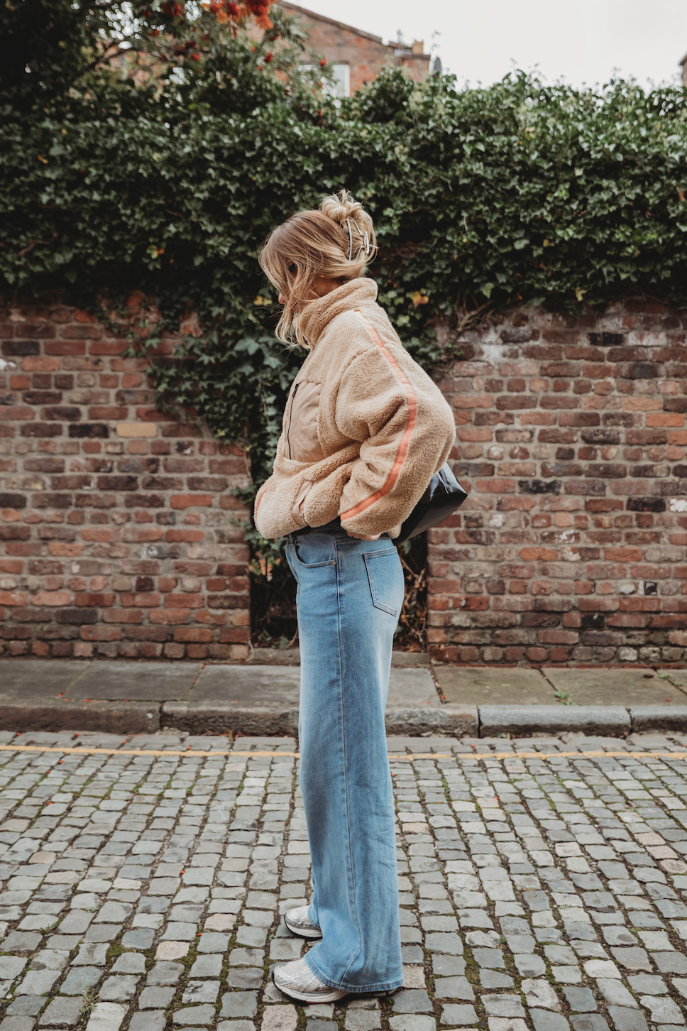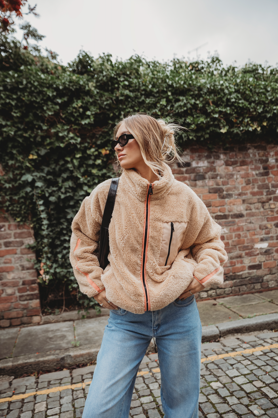 Oversized sand teddy fleece zip jacket with coral contrast details, made from doubled lined super soft, thick teddy fleece with side pockets and front zip pocket with black zip.
